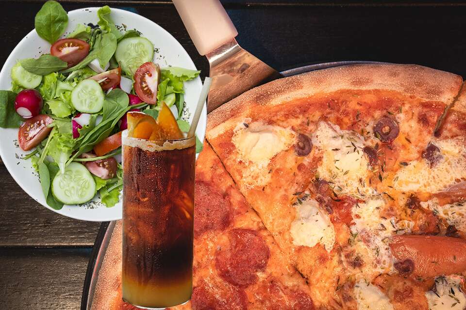 Small Cheese, Pepperoni, or Sausage Pizza, A Small Salad or Cookie, and a Fountain Drink.